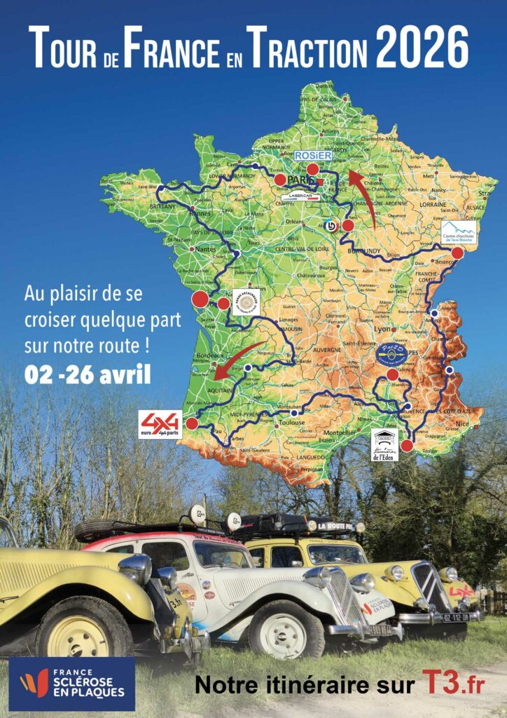 En avril 2026, nous organisons un Tour de France en Traction à la rencontre de français touchés par la sclérose en plaques, pour aller remercier nos fournisseurs et pour tester nos Traction-Avant. Ce « tour de chauffe » avec 3 de nos Traction-Avant est une sorte de repérage pour l’événement de LA ROUTE DE LA SEP 2027, qui va permettre de produire des films documentaires autour de la maladie silencieuse qu’est la SEP.