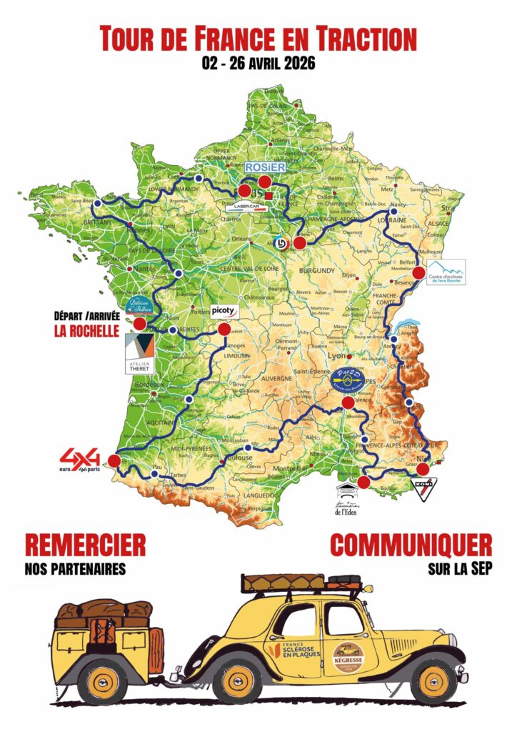 Sous forme de prologue de nos productions de films AVENTURE et SANTE en 2027 et 2028, nous partageons avec vous les péripéties d’un Tour de France en Traction en 2026. Durant tout le mois d’avril, nous allons remercier nos fournisseurs officiels, rencontrer nos amis SEPiens avec qui nous préparons un programme de communication 2027 / 2028 avec la fondation FRANCE SCLEROSE EN PLAQUES et prospecter des partenaires pour ce programme de production de films à venir.